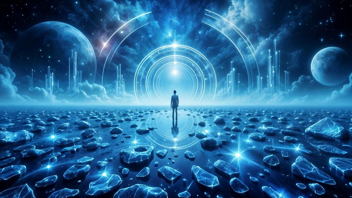 This image shows a surreal lake of reflective glass shards floating on a deep blue void, with ethereal mist and distant geometric structures, in a luminous, mystical style.