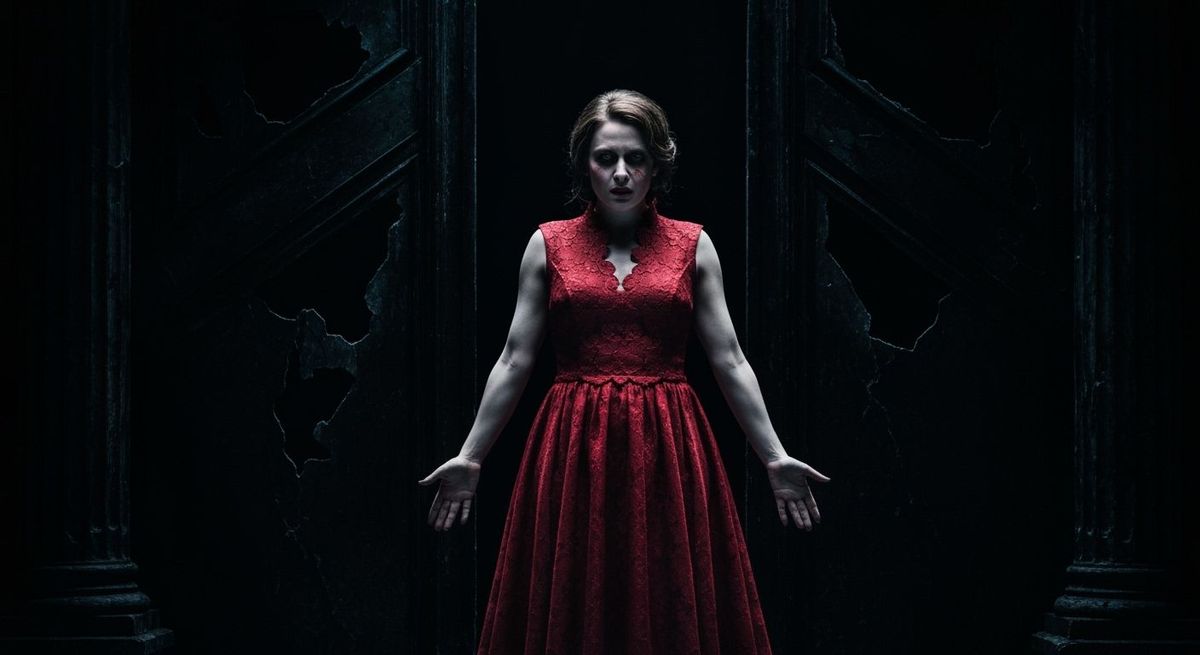 A theatrical high-contrast image shows a blonde anti-heroine with decaying features. Rich colors and a dark background enhance the ominous mood in this illustration.