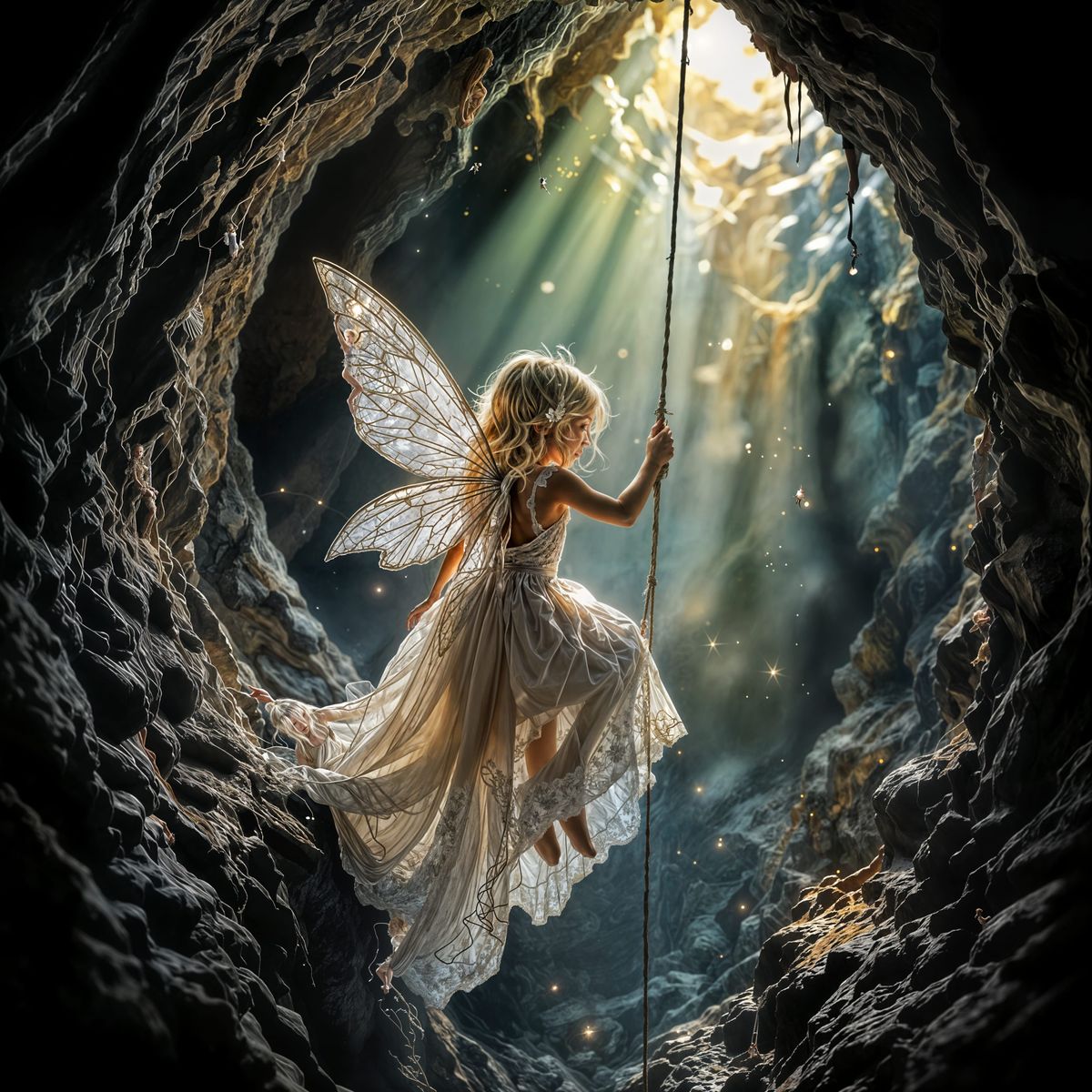 This image shows a young girl with fairy wings rappelling into a deep underground cave shaft while wearing a lacy dress.