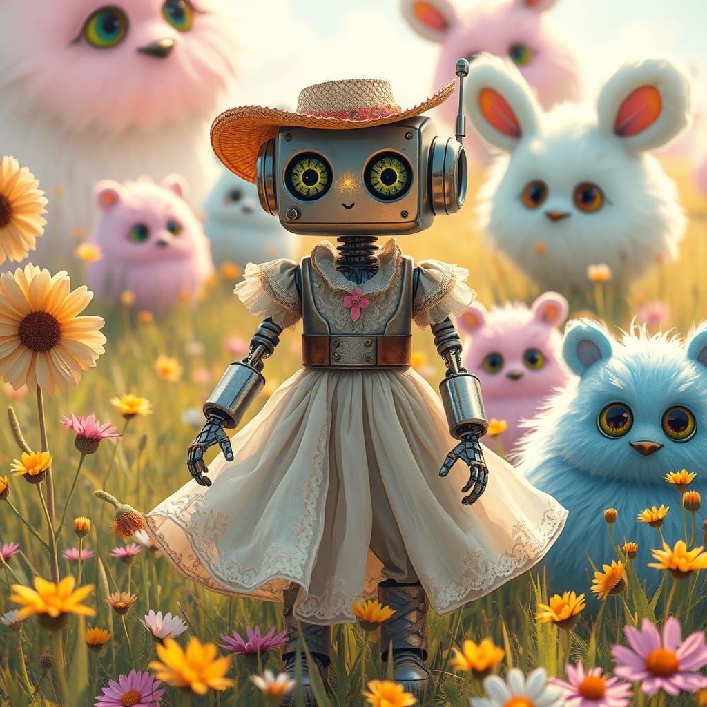 A digital illustration of a small robot in a floral dress standing in a wildflower field. The robot is surrounded by colorful, fluffy creatures, all rendered with playful brushstrokes and soft golden light as whimsical digital art.