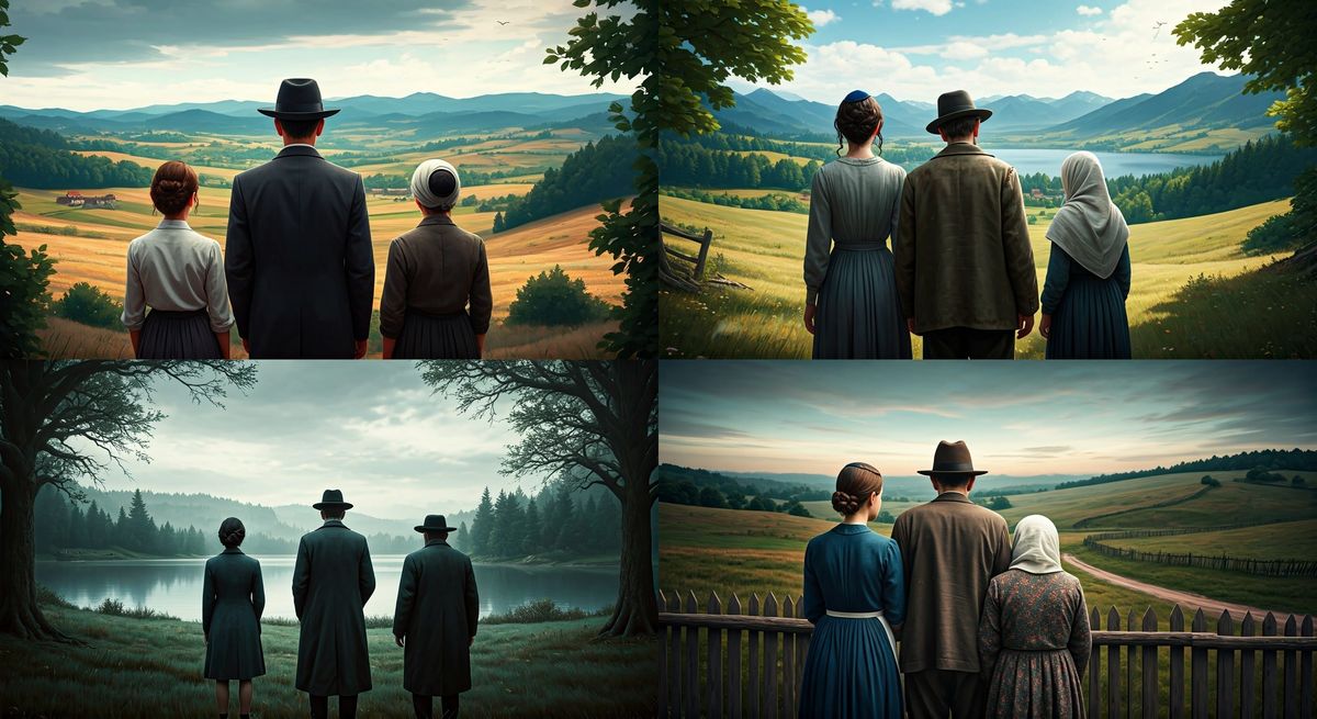 A serene image of a Jewish family standing together, seen from behind, amidst a lush European landscape. Created in a detailed matte painting style with deep colors, this artwork showcases intricate detail and a sense of fantasy.