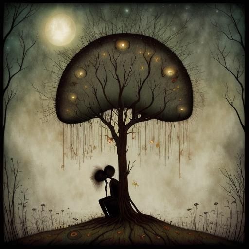 This image depicts a scene of overwhelming sadness and despair. The artwork evokes feelings of anguish and sorrow, rendered with surreal and emotionally charged elements.