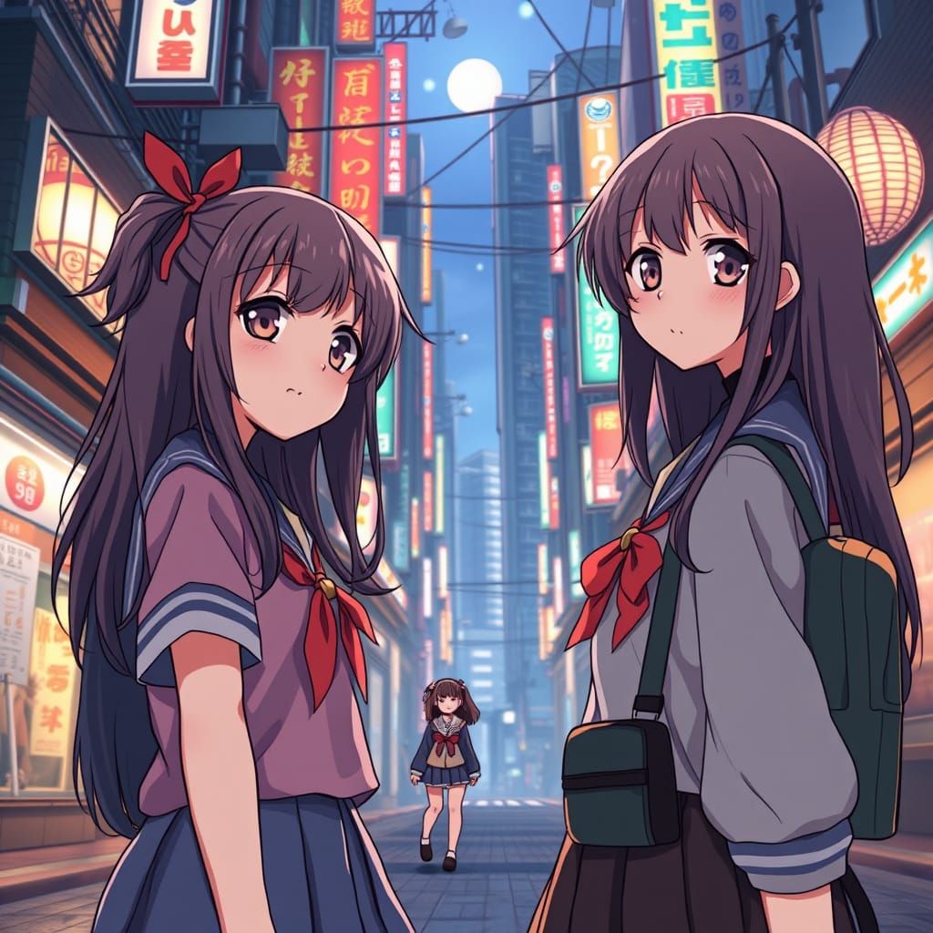 This image shows cute school girls in a futuristic Neo Tokyo setting. The artwork is evocative of anime key visuals and features deep colors and intricate details with natural lighting.