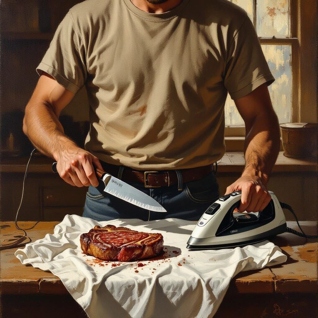 This image shows a person in jeans and a t-shirt inside a rustic home, holding a steak knife with a steam iron resting on their shirt, in a realist American painting style.