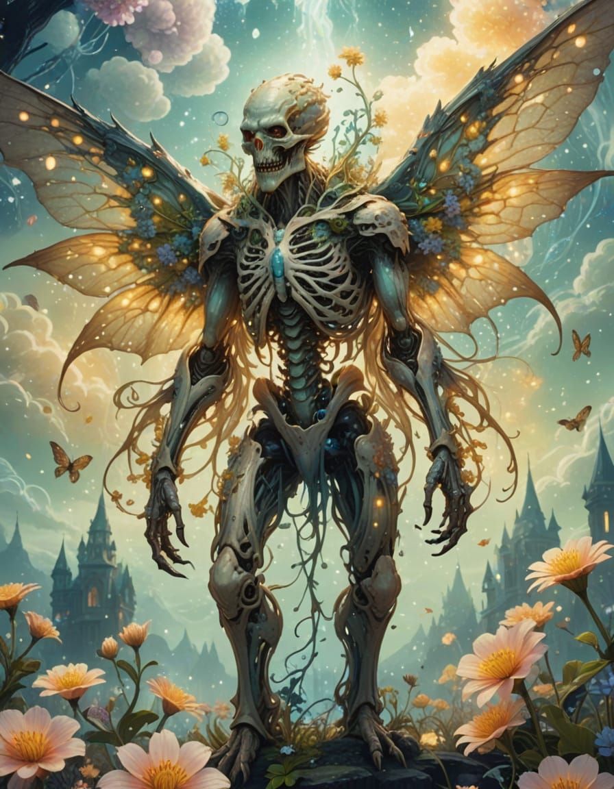 A striking picture of a benevolent monster amidst glowing flowers. The composition, with its sparkling particles and soft lighting, creates a magical atmosphere in a fairycore aesthetic.