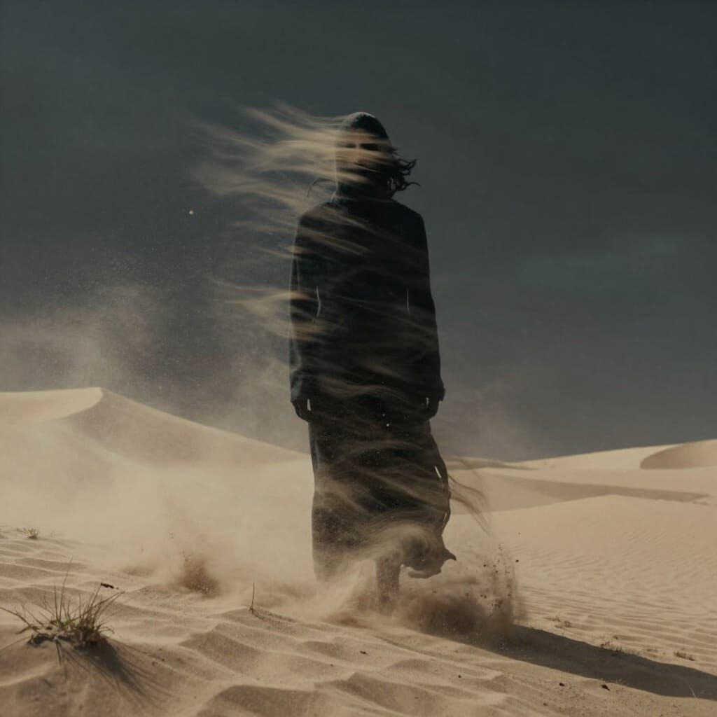 This image shows a shadowy, intangible figure in a surreal, dreamlike landscape. Sand blows from its eye sockets amidst a powerful sandstorm, rendered in a dark, unsettling style.