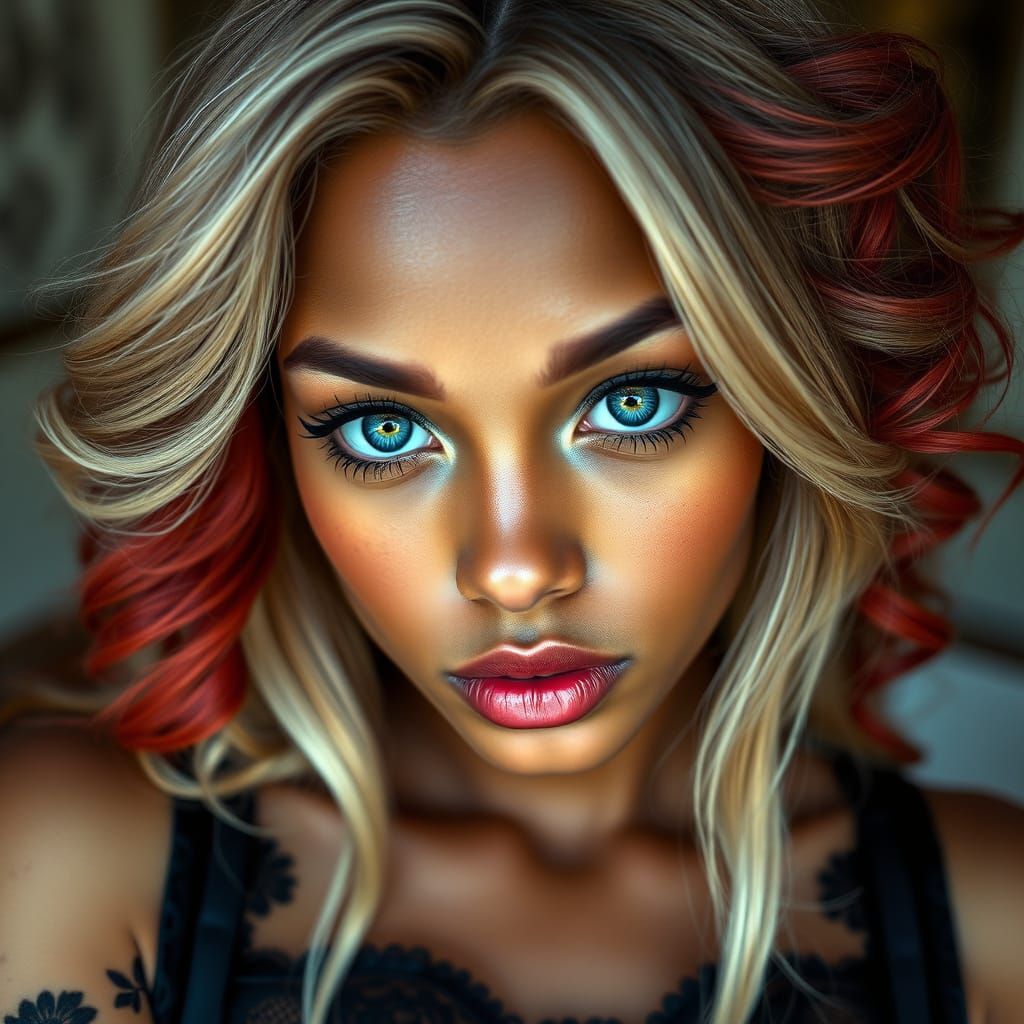 A photorealistic close-up of a beautiful 18-year-old woman with light skin, crystal-blue eyes, and silky blonde hair with red accents, wearing a black lace corset. The image features intense detail and texture.