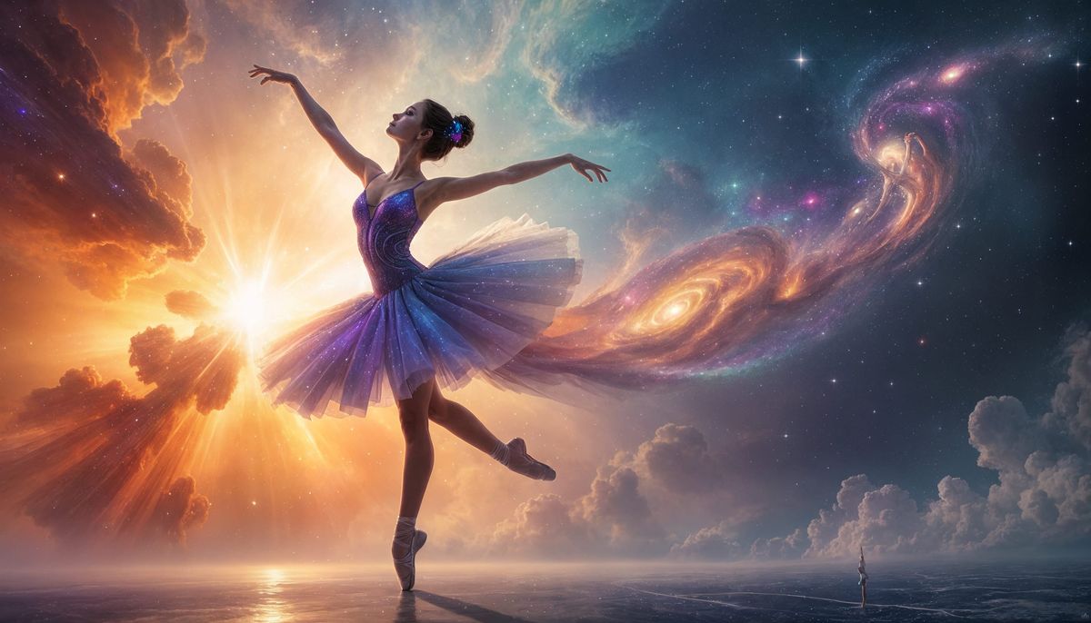 This image depicts a dancer made of nebulae and stardust, performing a pirouette near a dying star. Created in an epic fantasy concept art style with vibrant colors and immense scale.
