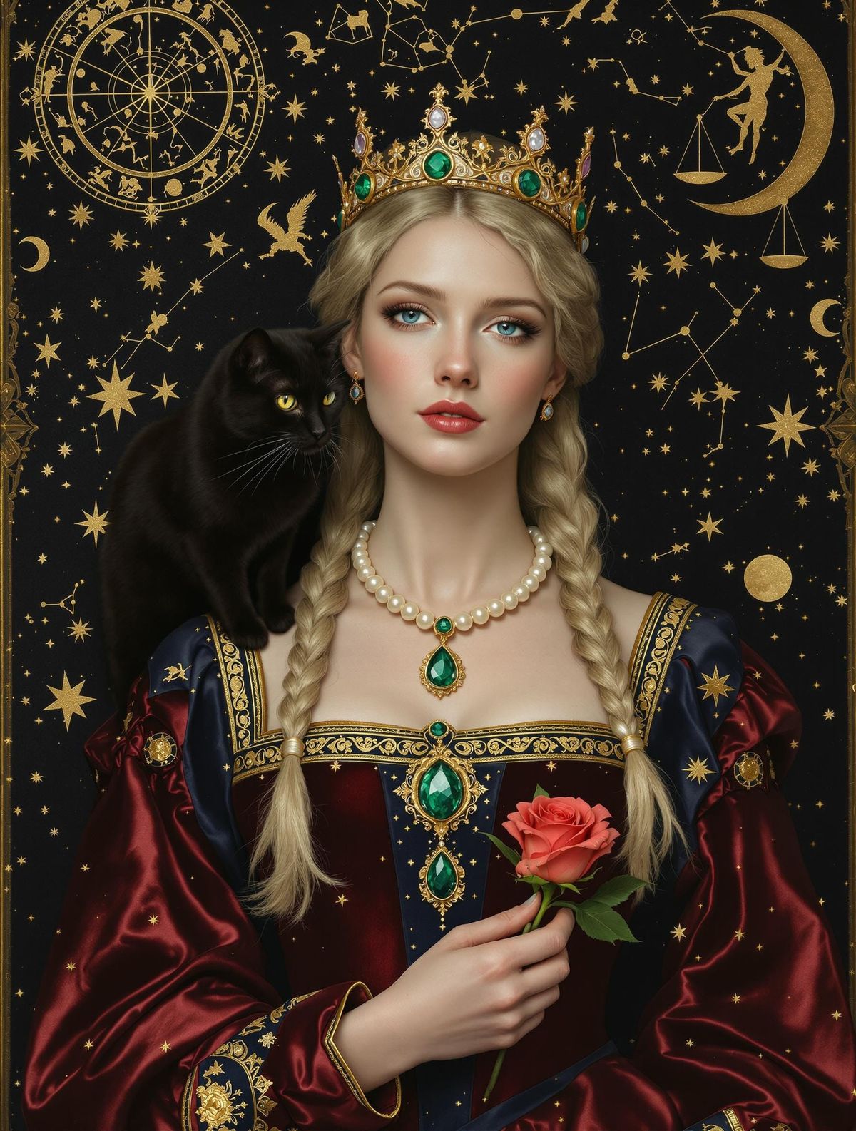 This image depicts a regal medieval queen, inspired by the opulence of Gothic illuminated manuscripts, with intricate gold embroidery and celestial maps, set against a rich dark velvet backdrop, surrounded by symbols of power and mystique.