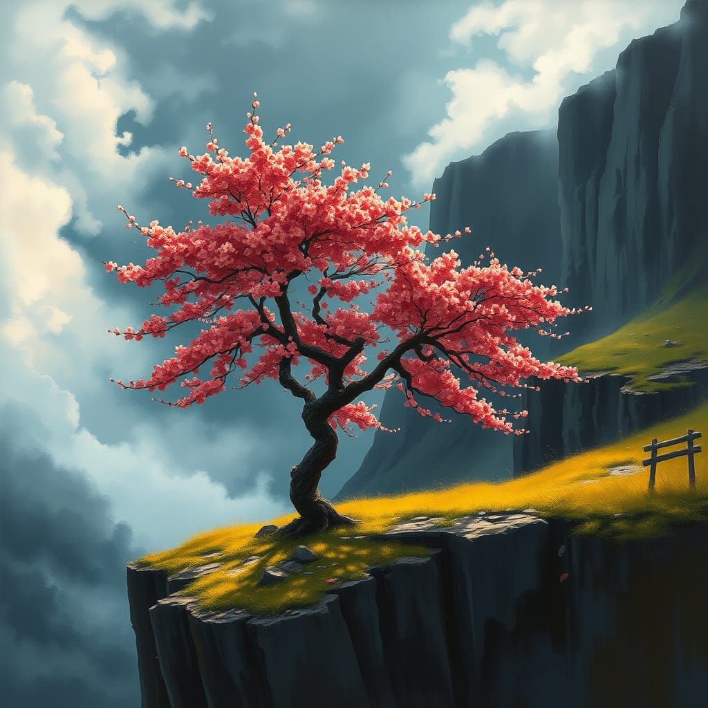 This image shows a solitary cherry tree with vibrant red blossoms perched on a cliff edge. A raging storm contrasts with a serene meadow in this vivid, high-contrast scene, rendered as an impressionist painting.