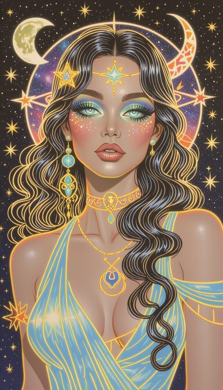 This image shows a beautiful enchantress with long curly black hair and turquoise eyes, rendered as 3D digital art. She wears a glowing blue gown adorned with celestial symbols beneath a starry night sky in a neon spacepunk style.