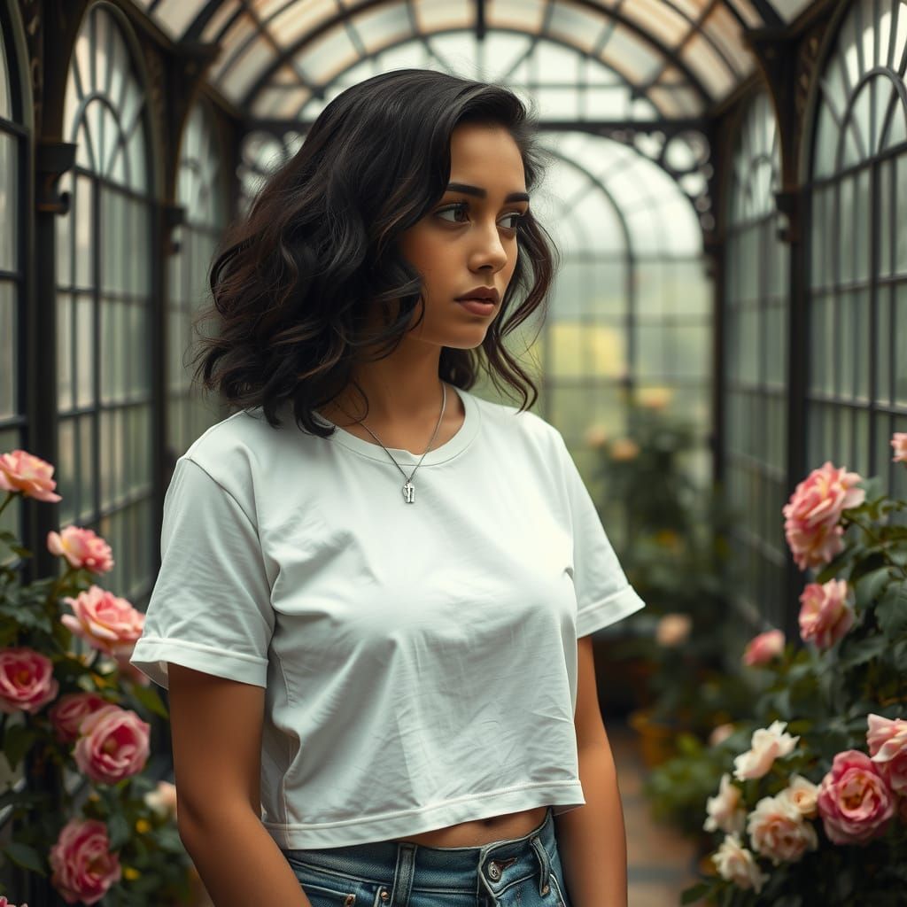 This image shows a young woman in a conservatory filled with roses. The portrait, reminiscent of classic photography, captures a moment of quiet contemplation with soft lighting and muted colors.