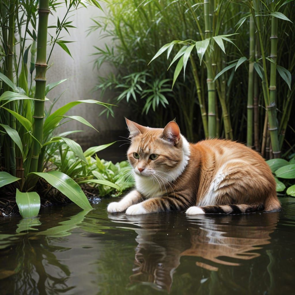 This image shows a cat sitting amongst bamboo plants. The scene features soft, muted colors creating a serene and somewhat ethereal atmosphere reminiscent of traditional Japanese art.