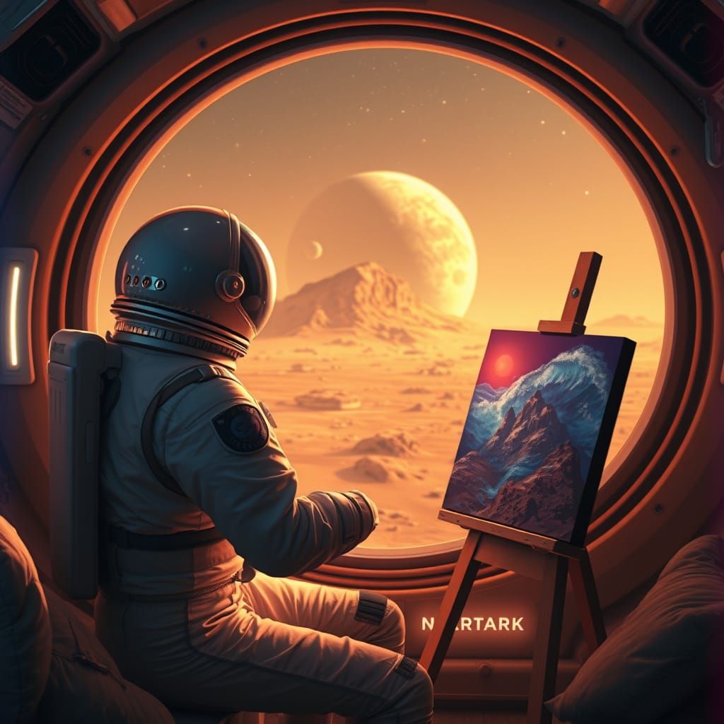 This image shows an astronaut inside a Martian habitat, painting a dreamlike vision of Earth's oceans. The artwork blends cinematic realism with a synthwave neon retro aesthetic.