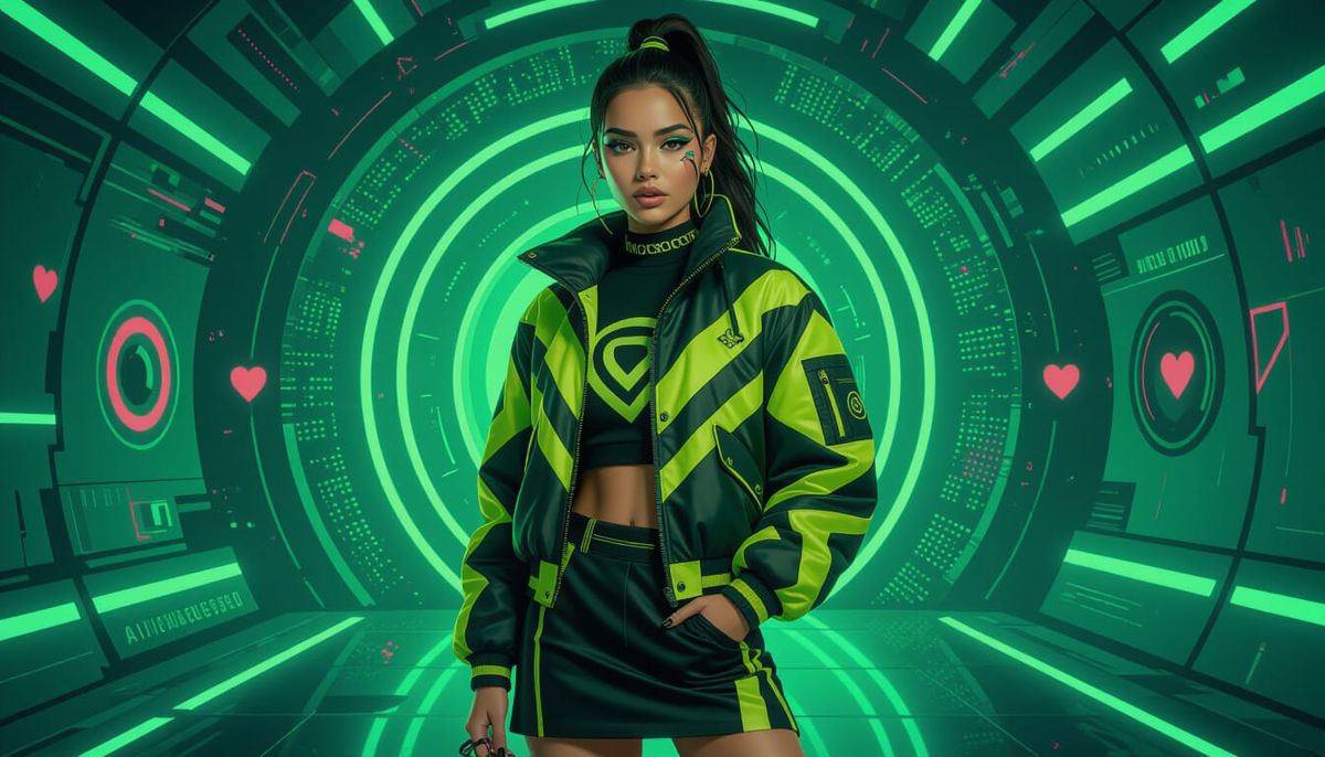 A full-body shot of a woman in a futuristic, vector-art-inspired outfit. The early 2000s aesthetic features neon green and black, geometric patterns, and reflective elements. Soft lighting enhances the utopian tech environment.