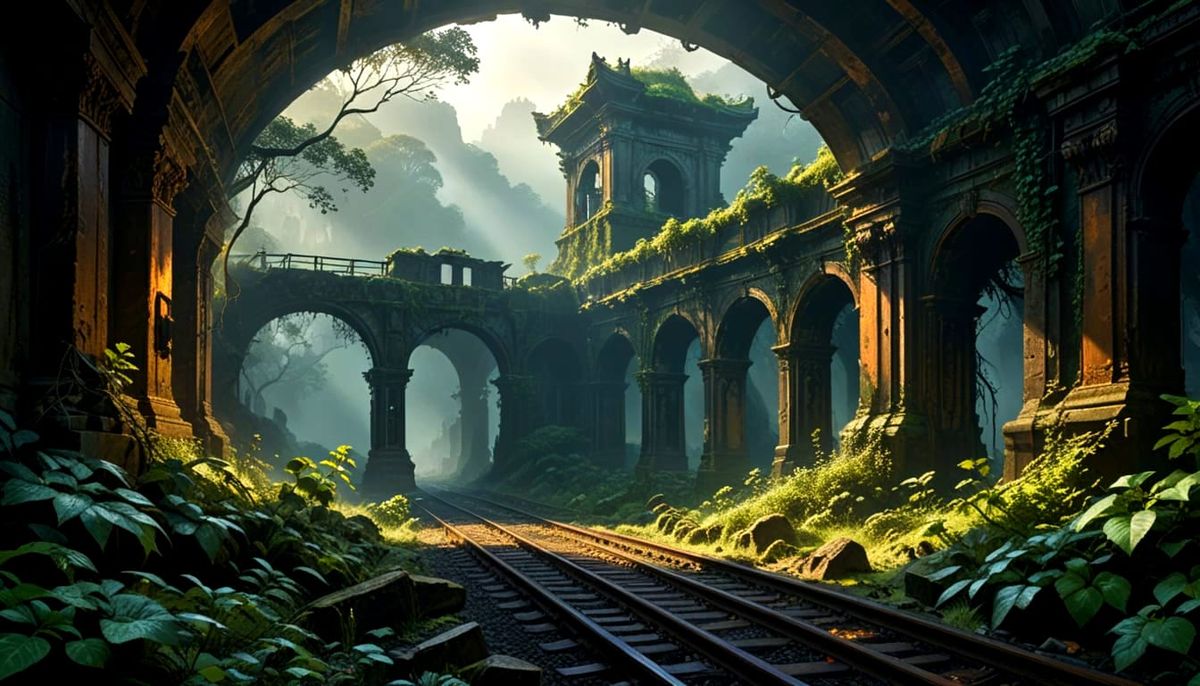 This hauntingly beautiful image depicts a mystical valley where ancient ruins merge with a rusted train, overgrown by a dense jungle. Soft gradient washes of emerald and midnight blue evoke a serene atmosphere, punctuated by shafts of moonlit silver and delicate gold leaf glimmers.