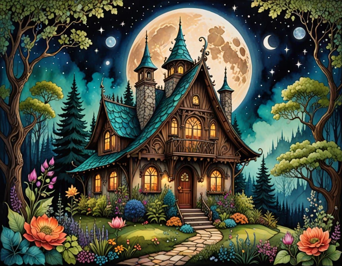 Intricately detailed alcohol ink illustration, a charming witchy cottage in an enchanted forest, Zentangle, fantasy illustration, detailed painting, and vibrant color, Detailed flowers and leaves, plants, elegant fine lines, Moon, Stars, Crystals, glowing magical lights