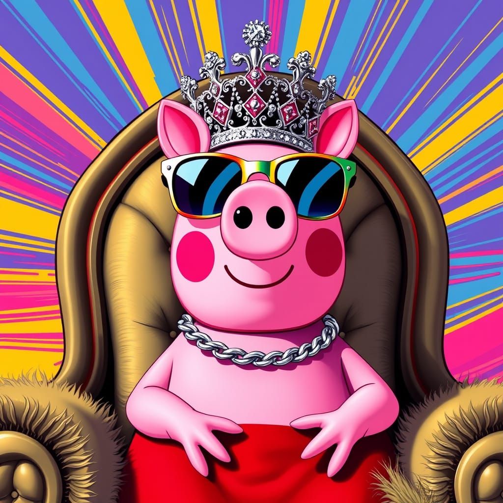 This image shows a confident, sassy Peppa Pig reclining on a throne, wearing a tiara, silver chain, and sleek sunglasses with brightly colored frames and reflective lenses, set against a vibrant, dynamic background in a fusion of pop art and manga-inspired styles.