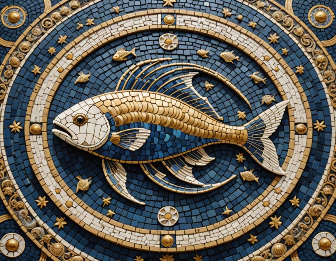 This image depicts a vibrant Ancient Greek-style mosaic representing the Pisces zodiac, dominated by blue, white, and gold hues.