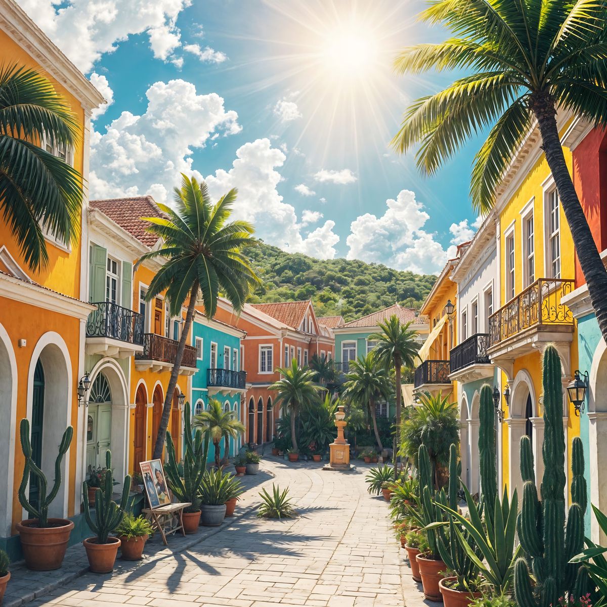 A vibrant digital artwork capturing Kralendijk's historical center in radiant sunlight. The scene blends Caribbean and Dutch Colonial architecture, showcasing the island's arid, tropical climate with colorful facades and lush vegetation.