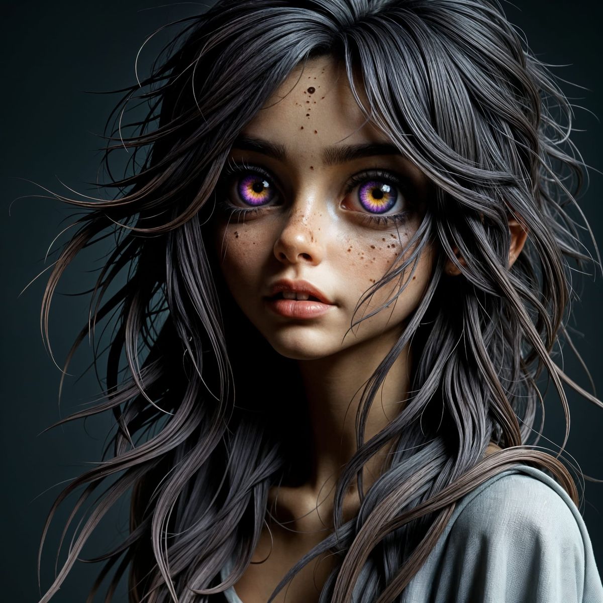 This image shows a woman in her early 20s with a weathered face and ethereal glow. Her eyes shimmer with otherworldly iridescence, hinting at a hidden power. The image has a trippy aesthetic.