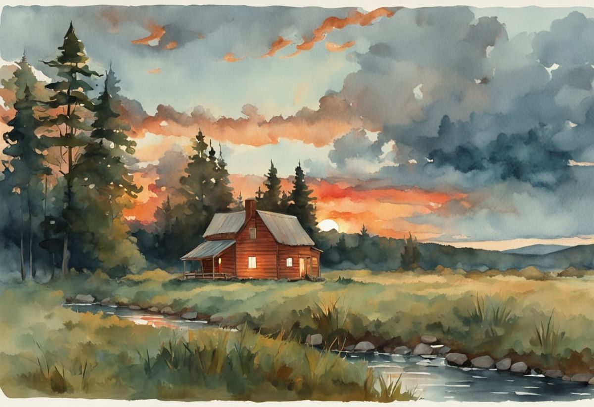 A watercolor painting of a cabin beside a stream in a meadow at sunset. Warm colors and soft brushstrokes create a serene and idyllic landscape with glowing sky and gentle trees.