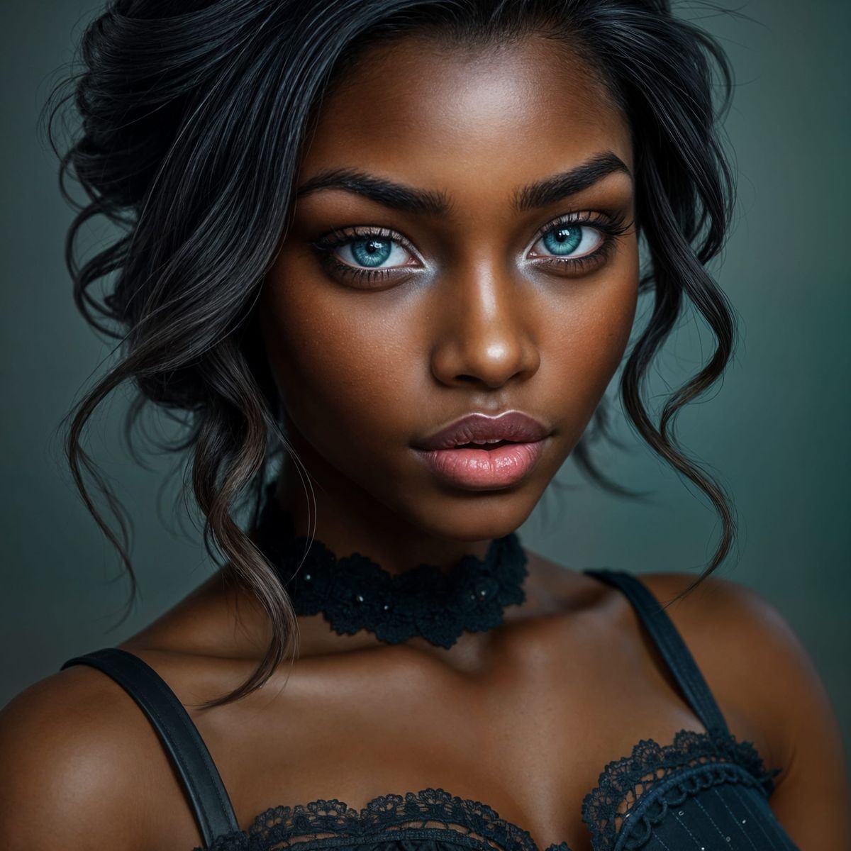 A realistic portrait of a beautiful light-skinned Afro-American woman with silky black and brown hair, turquoise eyes, and freckles. She wears a black lace corset in a photorealistic style.