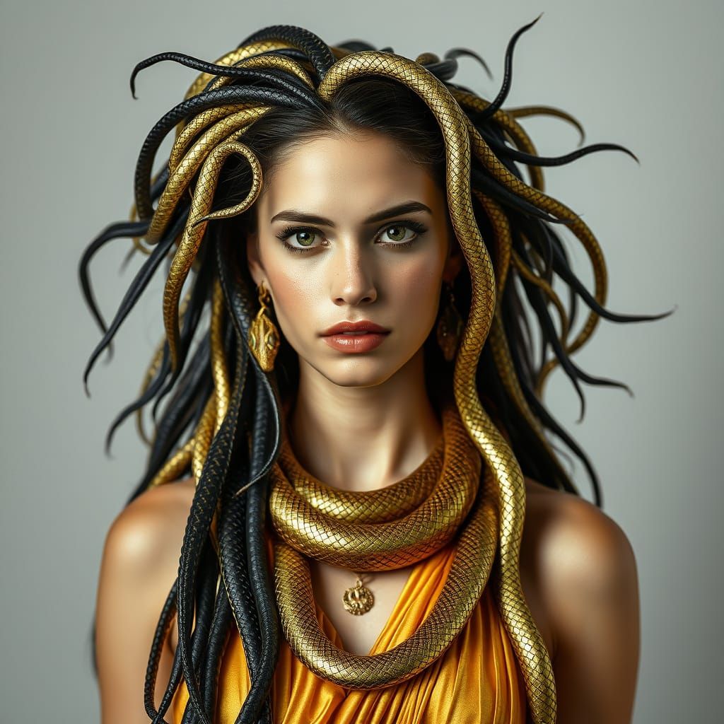 This image shows a young Greece goddess with a mesmerizing, snake-adorned headdress and a golden, serpent-made dress, exuding a sense of mystique and ancient charm.