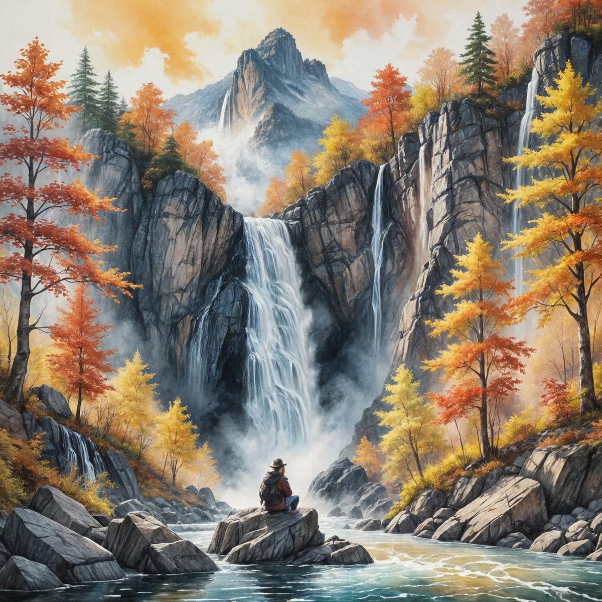 This image shows a lone traveler sketching a powerful mountain waterfall amidst autumn trees, rendered with a watercolor effect and black ink outline. It captures a serene and contemplative atmosphere.