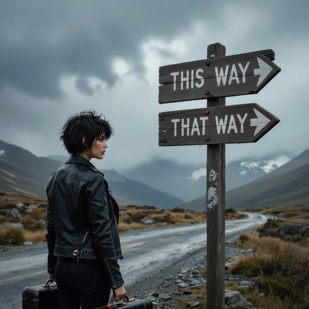 This image shows a woman in a leather jacket holding a suitcase at a mountain trail intersection. A wooden sign with a two-headed arrow points in different directions under a stormy sky.