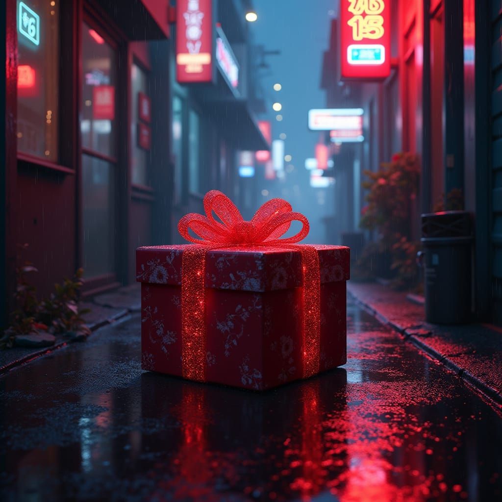 This image depicts a cyberpunk Christmas gift box illuminated by neon lights in a futuristic, wet alleyway. It features dramatic lighting and saturated colors, evoking a cinematic, gritty atmosphere.