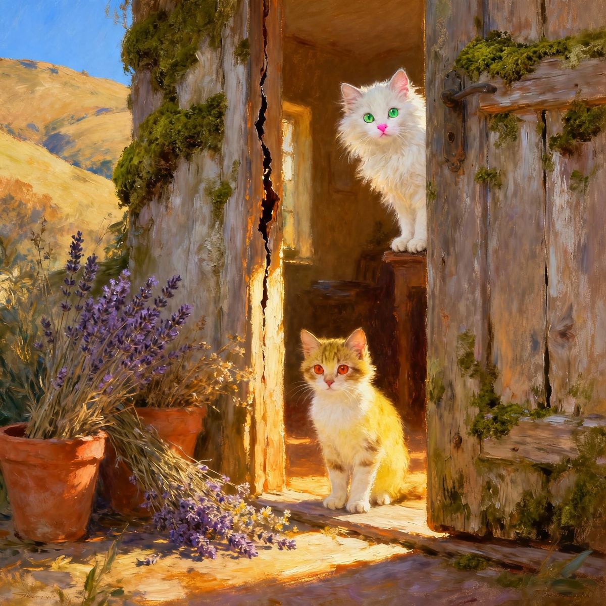 This image depicts a charming, painterly scene of a weathered wooden door ajar, showing a warm interior. Two cats, one white and one yellow, are near the entrance, with lavender and wildflowers. The style is reminiscent of Impressionism, with soft brushstrokes and warm, golden light.