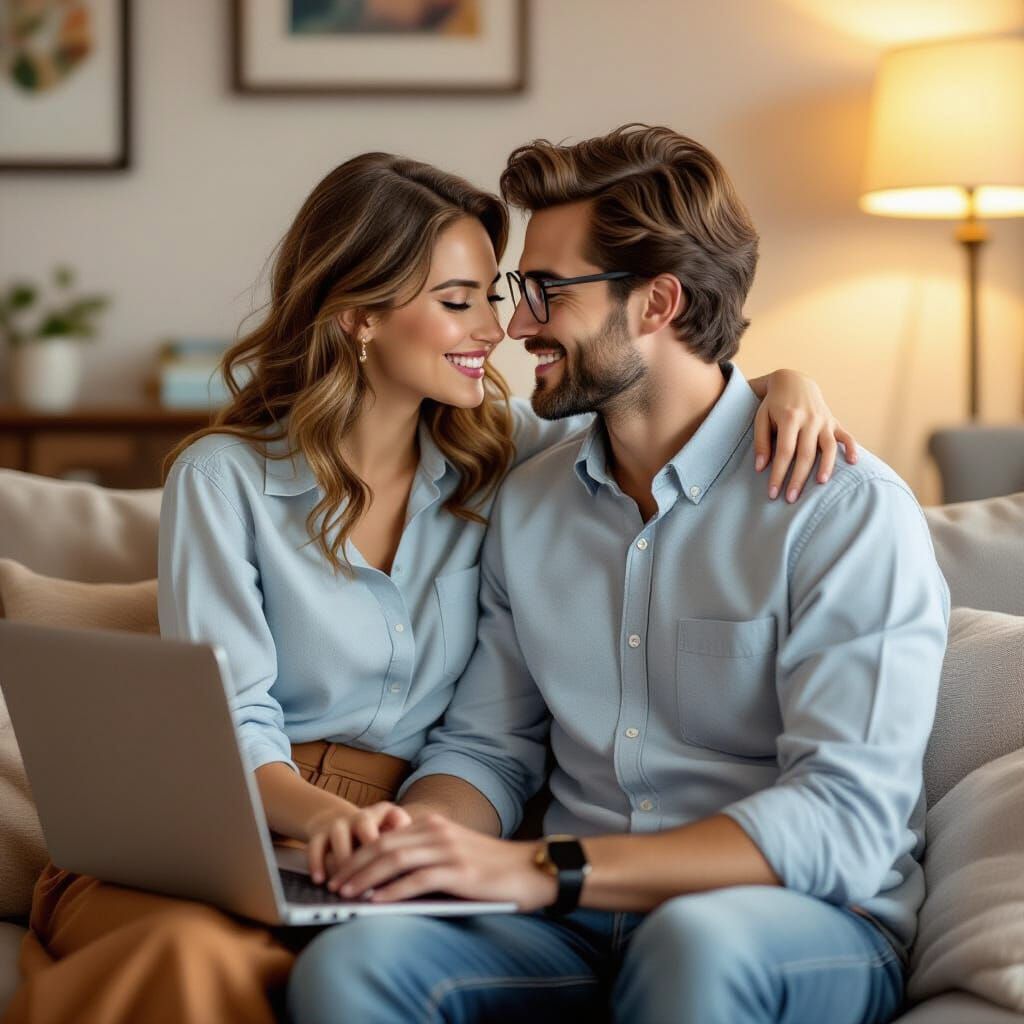 A captivating image of a young couple sharing a kiss in their cozy apartment. The scene is lit with warm, golden light, rendered with photorealistic details and atmospheric cinematic realism.