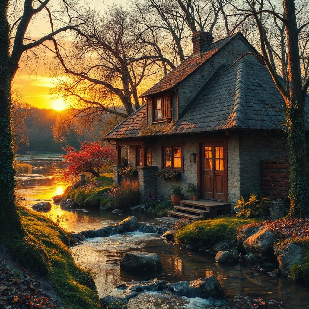 A picturesque view of an aged cottage beside an enchanted stream at sunset. The image showcases soft, blended watercolor techniques with vivid, shimmering colors and warm lighting, creating a dreamy, ethereal atmosphere.