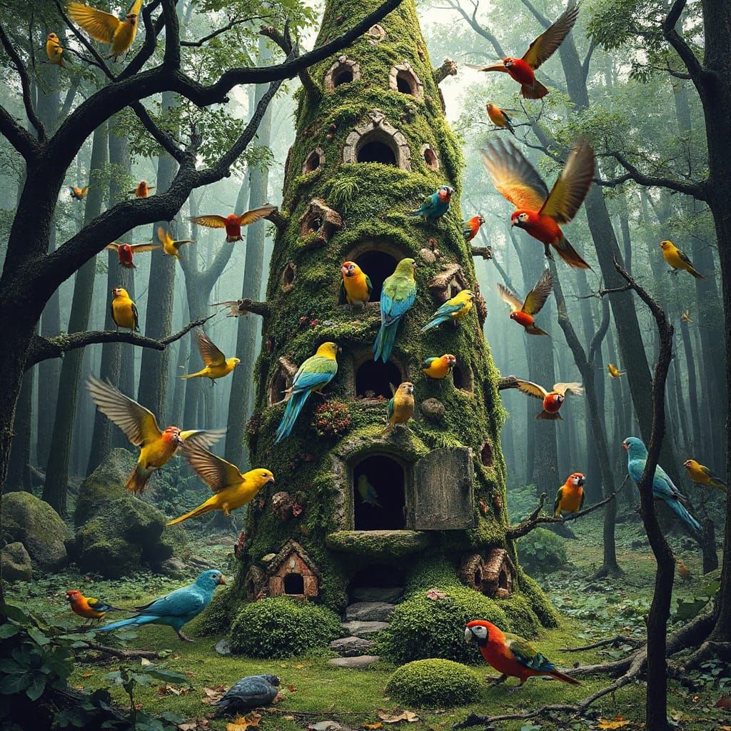 A fantastical birdhouse resembling a skyscraper covered in moss is set in a forest clearing, with colourful birds flying around it. The artwork is reminiscent of surrealist paintings.