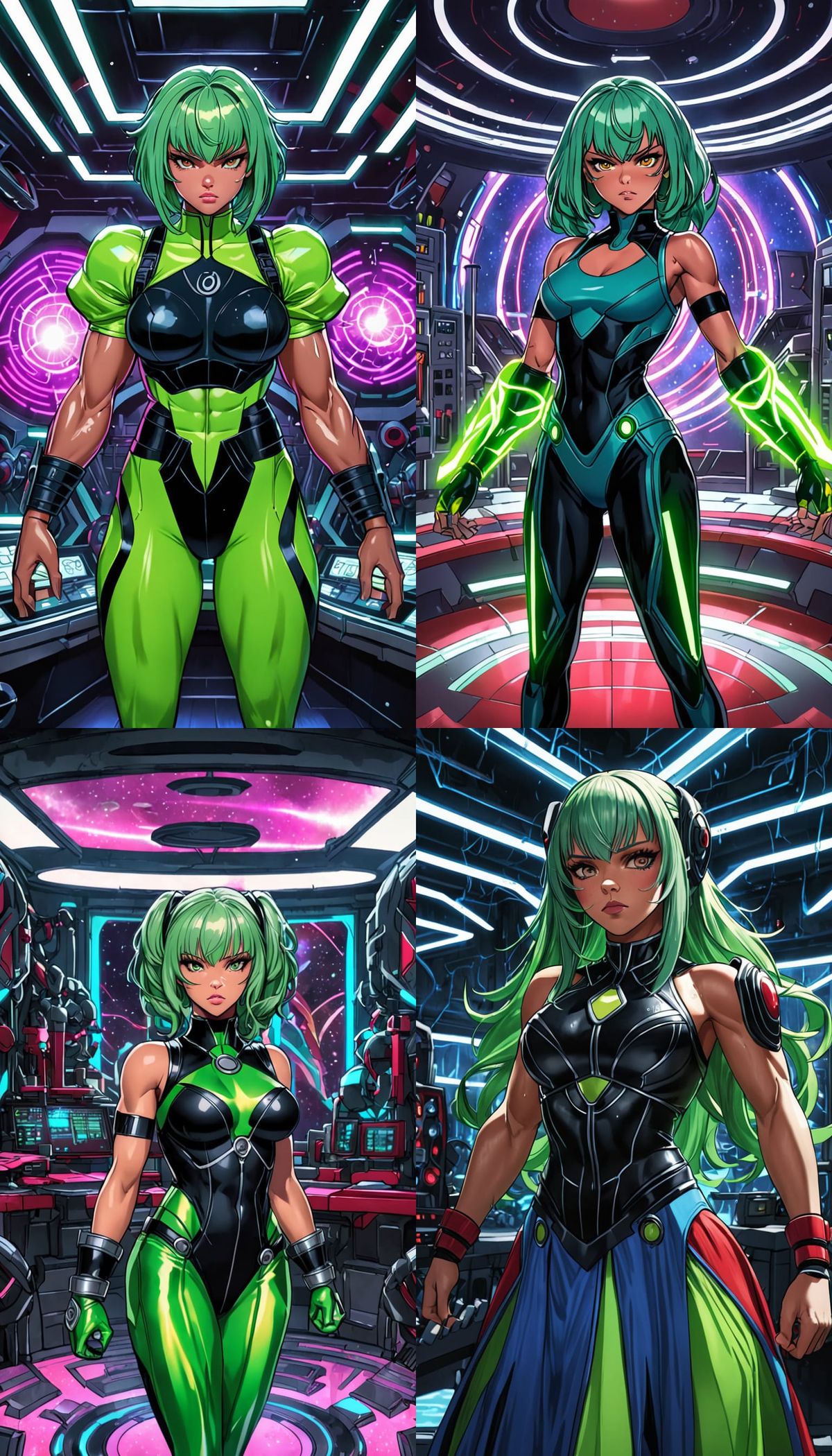This image shows a muscular Greek woman with green hair in a futuristic laboratory. The anime-style art features dynamic figures and dramatic shading, reminiscent of classic manga.