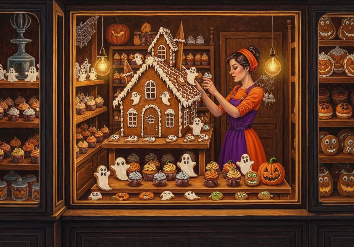 This detailed oil painting captures a bakery window decorated for Halloween. A woman in orange and purple crafts a gingerbread haunted house filled with spooky treats, bathed in warm, festive light.