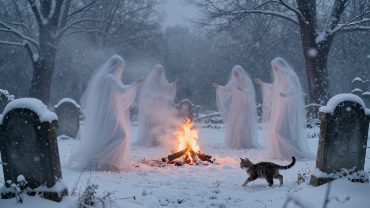 This image depicts a serene 1800s graveyard in a gentle snowstorm, transformed into a winter wonderland. Lost souls gather around a warm fire, with a playful kitten nearby, in a Romanticism-inspired style with moody lighting and cool tones.