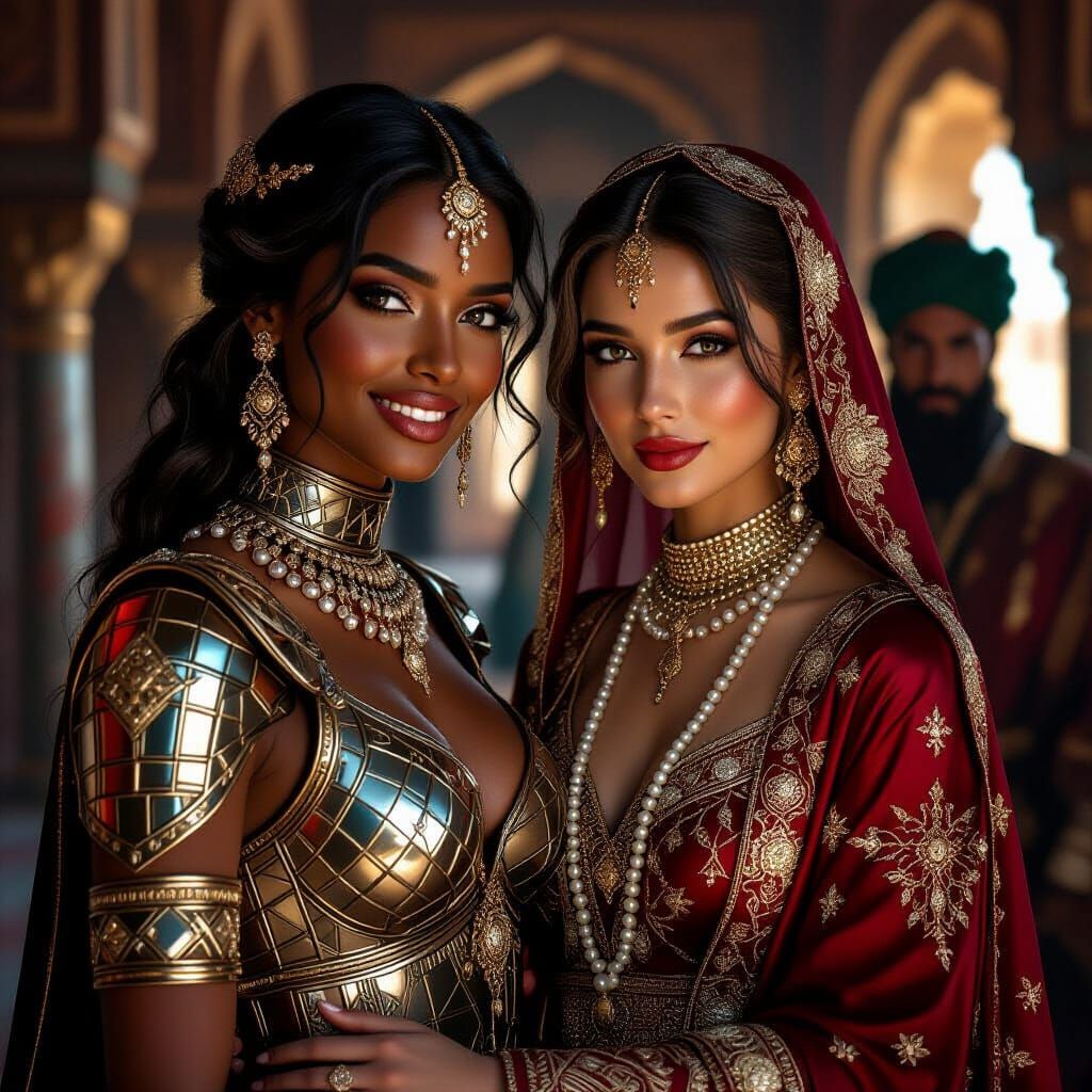 This image shows two beautiful women in an opulent palace setting. One woman has dark skin and wears metallic grid attire, while the other has fair skin and is adorned with rubies and pearls, in a photorealistic style.