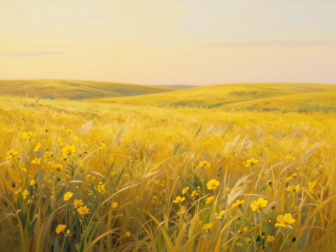 This image shows a serene landscape dominated by yellow hues. Rolling fields of tall grass and yellow wildflowers glow under diffused sunlight, creating an optimistic and peaceful mood in a painterly realism style.