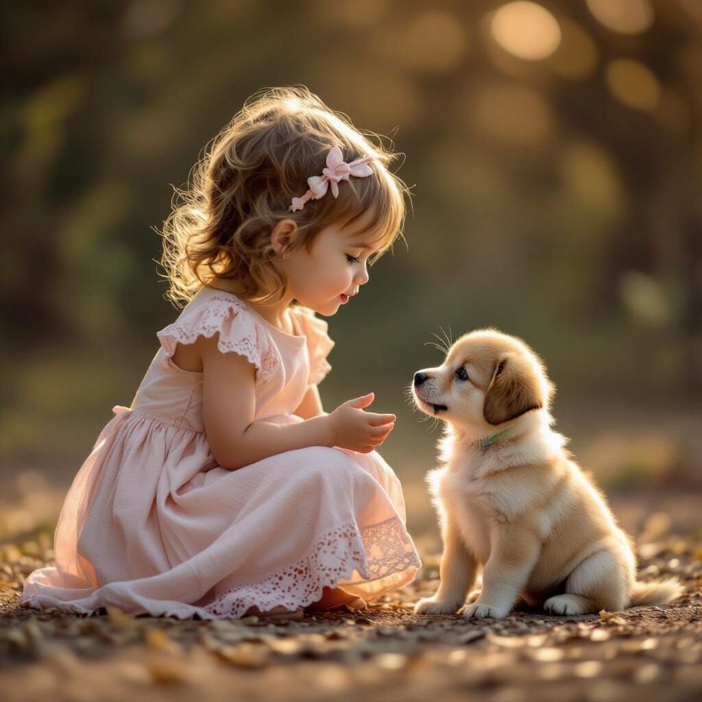 This image shows a hyperrealistic scene of a young girl in a pink lace dress interacting with her small puppy. Features cinematic lighting and a soft focus effect.