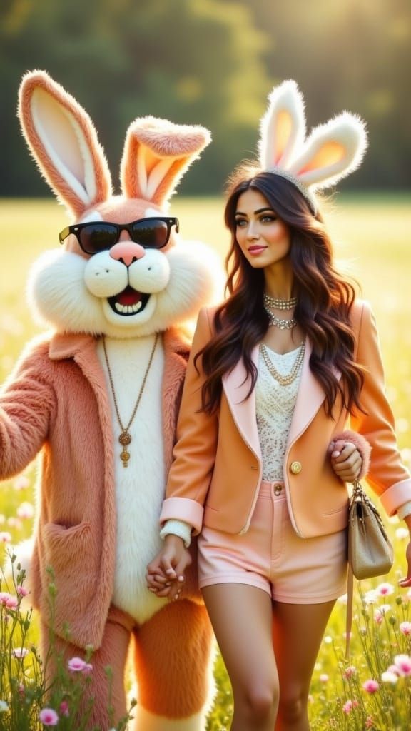 This image shows a serene and playful scene of a woman and Easter Bunny walking hand in hand in a sunny meadow filled with wildflowers, captured in a photorealistic style with attention to detail and a touch of whimsy