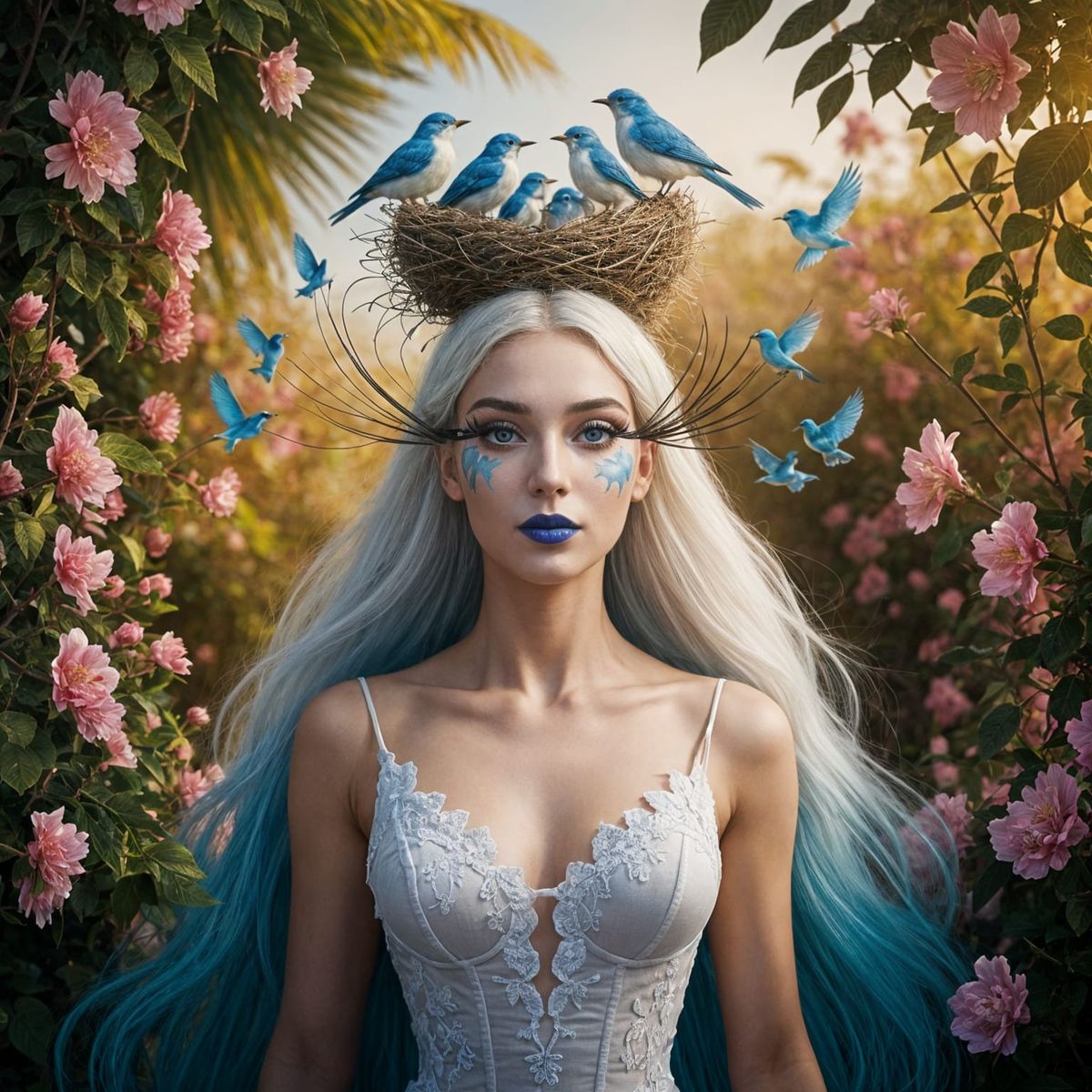 A striking picture of a woman with white face paint and blue lips. Her hair forms a bird nest with bluebirds, and her eyelashes transform into fluttering birds in a tropical setting.