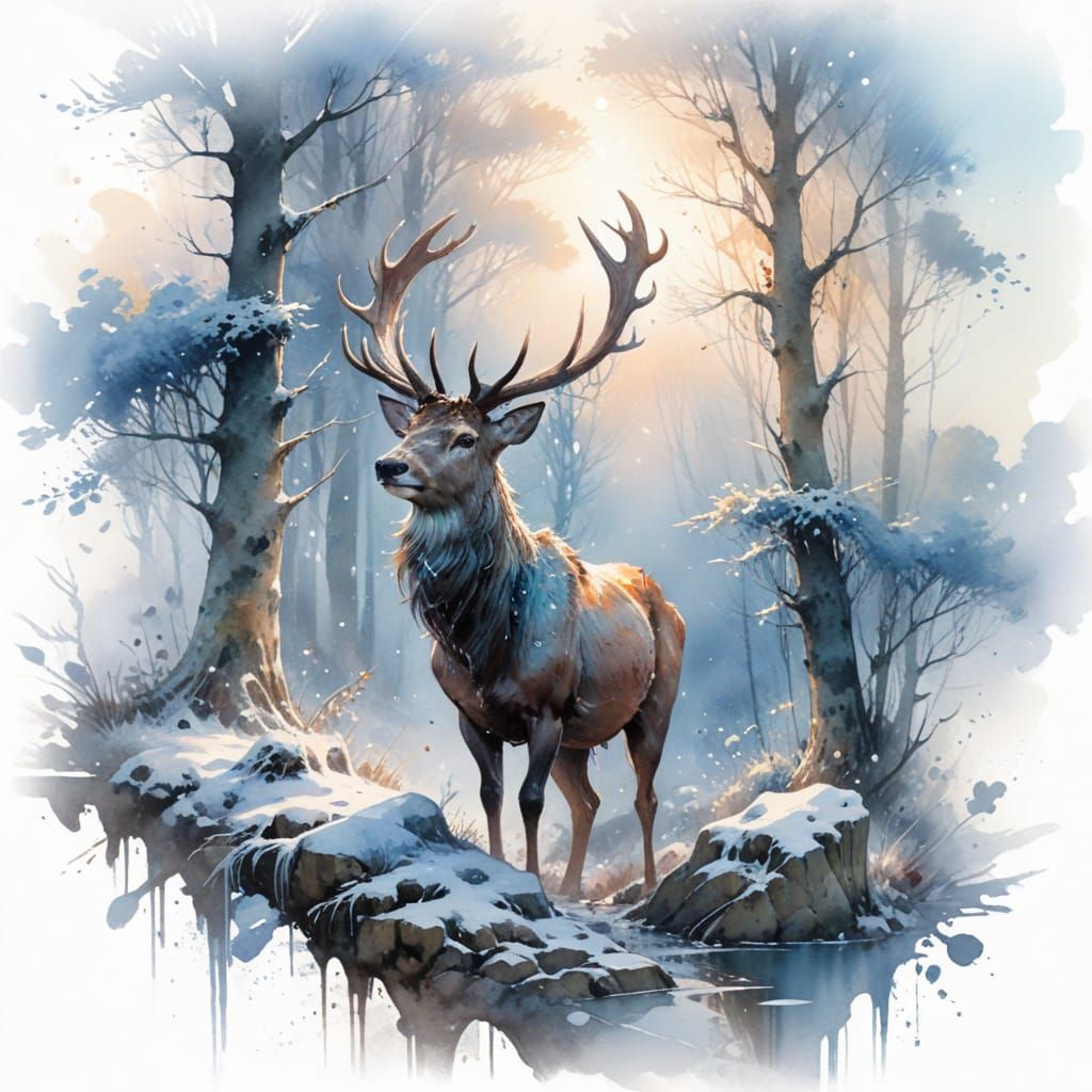 This enchanting watercolour painting depicts a serene winter landscape with a majestic stag, set against a pale blue sky and delicate frost-kissed trees. The artwork masterfully blends styles, creating a mesmerizing fusion of chaos and beauty.