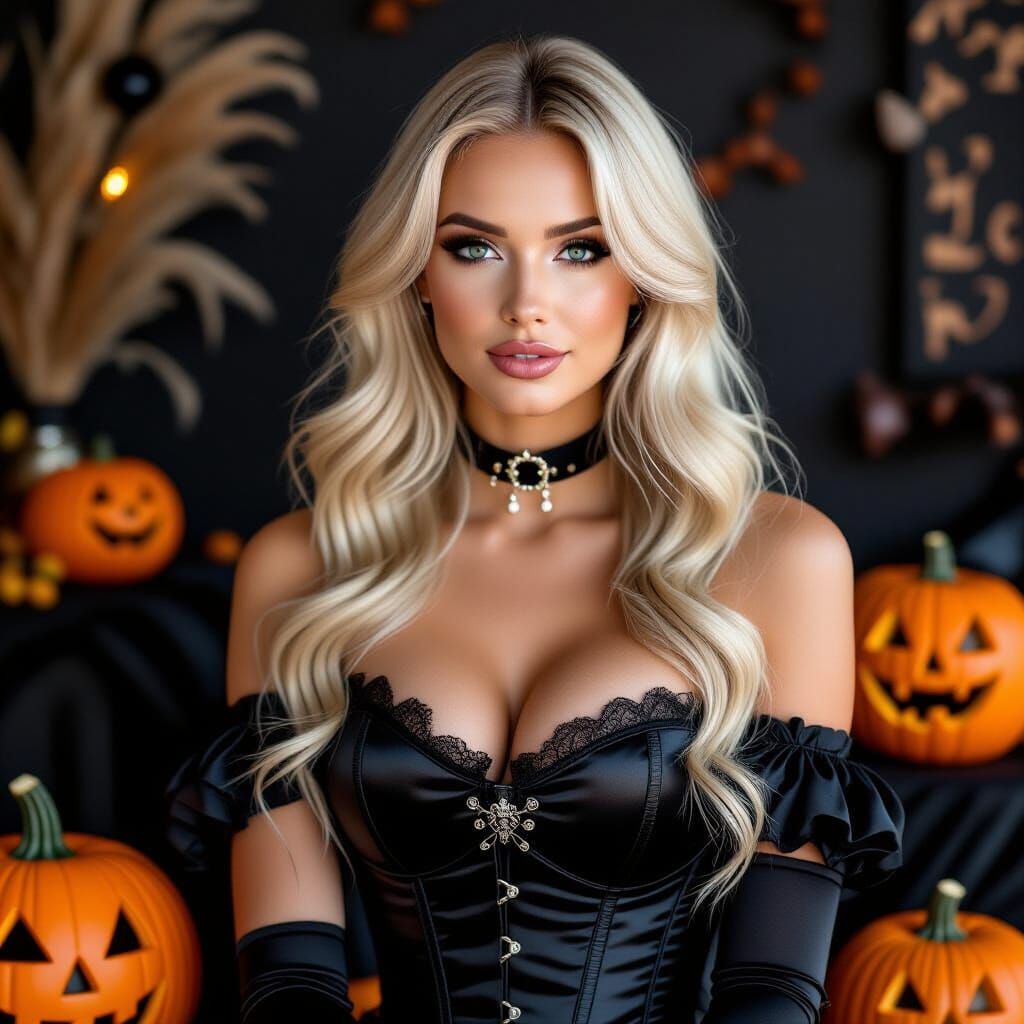 This image features a pretty blonde woman dressed in a satin Halloween corset, seated amongst festive Halloween decorations.