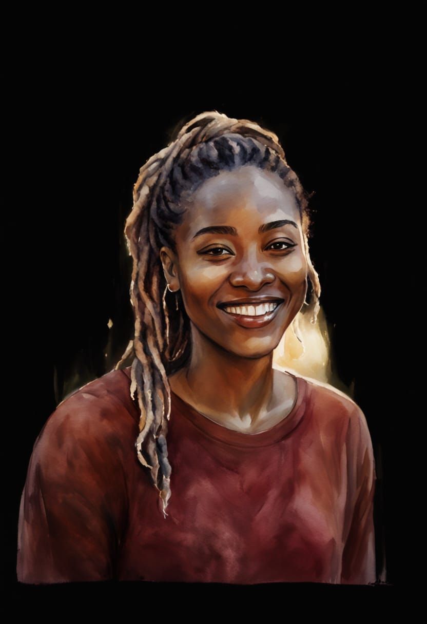 A close-up watercolor portrait of a smiling young Black woman with brown eyes and a dreadlock ponytail. The artwork uses soft focus, expressive brushstrokes, and warm golden lighting.