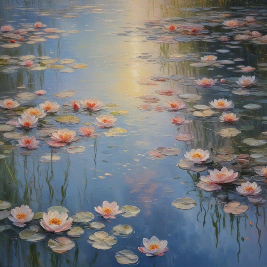 This image shows warm water with softly falling petals under a dawn or dusk sky. Rendered as an impressionistic oil painting with a soft, muted color palette and delicate textures.