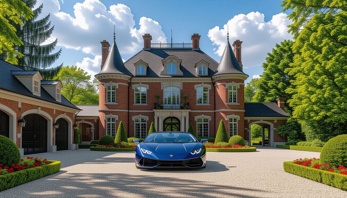This image showcases a grand Victorian chateau and a navy blue Lamborghini parked in a vibrant summer garden. Captured with painterly textures and rich hues, inspired by Impressionist art.