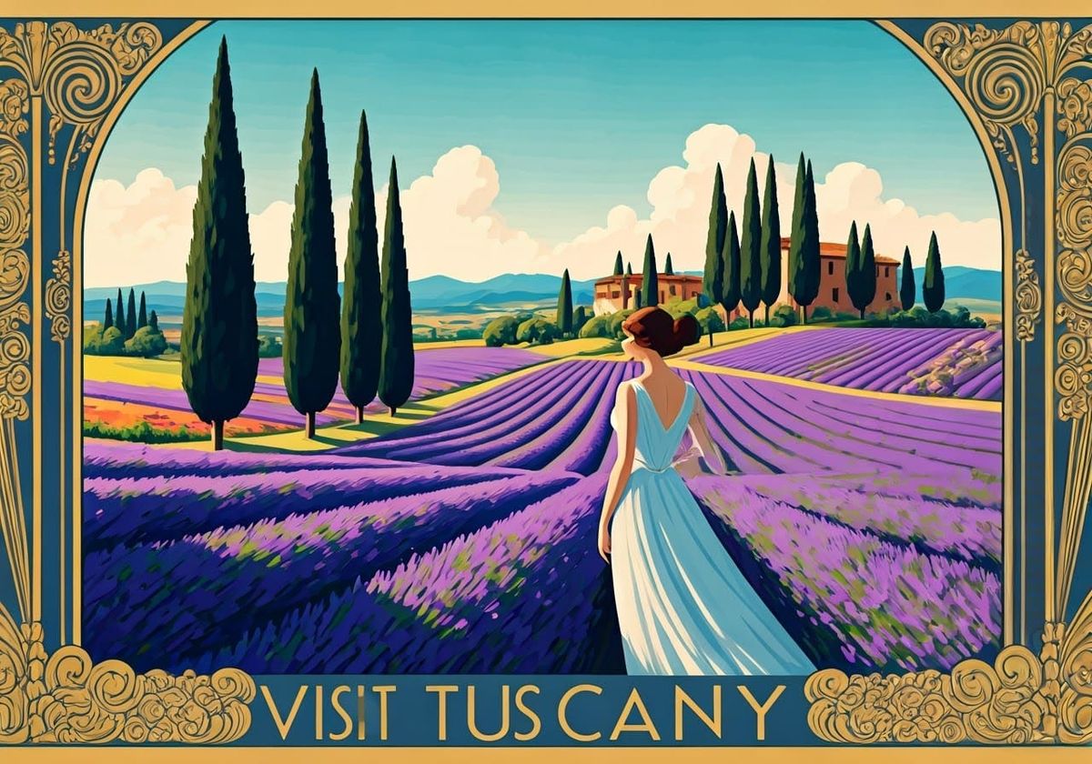 This image features a beautiful woman standing amidst vibrant purple lavender fields, Italian villas, and tall poplar trees, set against a brilliant blue sky, in the style of classic art deco with gold accents and curved lettering.