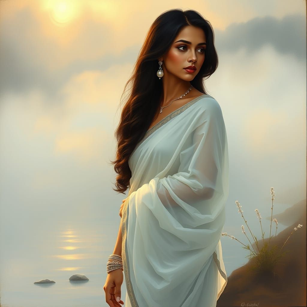 A young South Asian woman with flowing black hair stands at the edge of a misty lake, draped in a translucent white sari that clings to her form, adorned with pearl earrings and delicate silver anklets. The soft morning light filters through the mist, casting a gentle glow on her serene face as she gazes ...